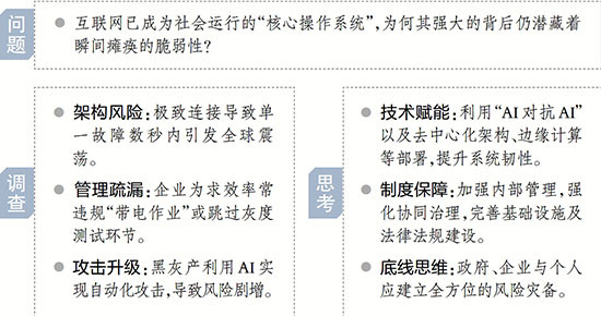 “在强大的技术面前,互联网可谓‘漏洞百出’。关键就在于这些漏洞是否暴露、是否被恶意利用。”专家指出,网络崩溃背后,除了光纤被挖断、火灾、断电等意外,人为因素已成为最大变量。