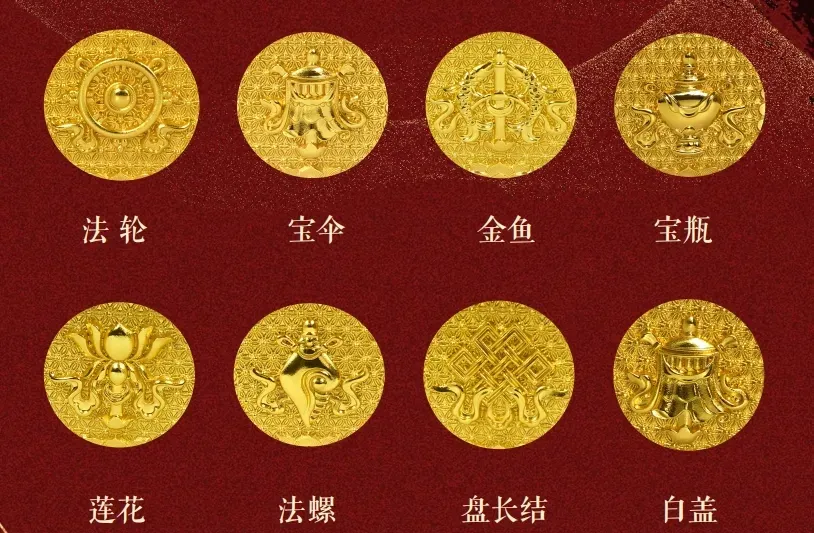 法轮代表圆满无缺、宝伞寓意守护安康、金鱼象征富足有余......