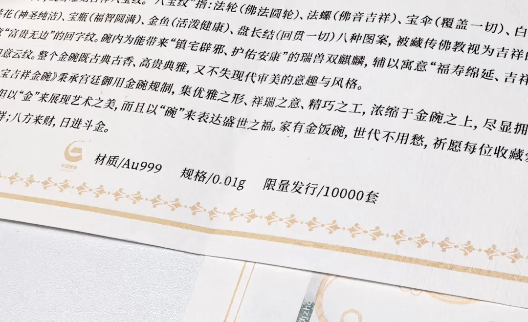 为了让大家放心收藏,《八宝吉祥碗》配备了收藏证书、贵金属检测证书、保养说明书。