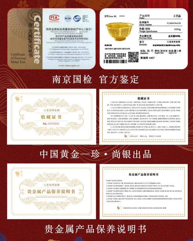 每一件金碗均经过国家金银制品质量检验中心的严苛检测,并获得南京国检的官方认证。