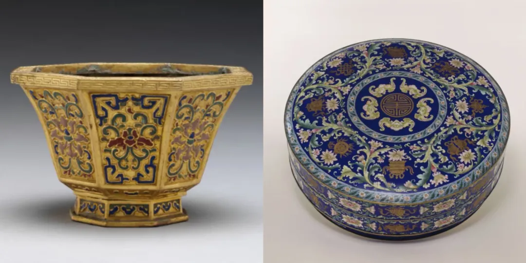 《掐丝珐琅勾莲纹八方盒》与《画珐琅缠枝莲八吉祥纹攒盒》。