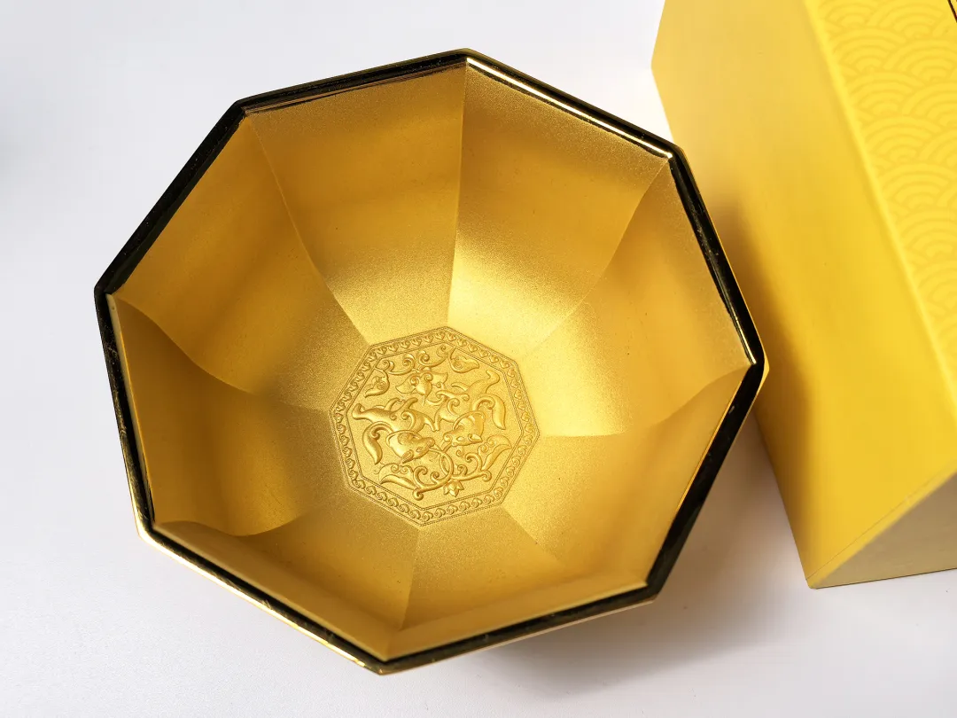并以此为器型蓝本打造了这樽「八宝吉祥金碗」,将八方盒的形制之美,与攒盒的纹饰之韵,巧妙地融为一体,化“盒”为“碗”。