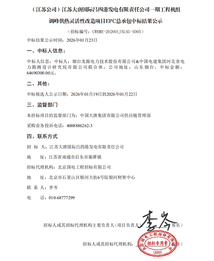 1月23日,中国大唐集团有限公司大唐电子商务平台发布(江苏公司)江苏大唐国际吕四港发电有限责任公司一期工程机组调峰供热灵活性改造项目EPC总承包中标结果公示,烟台龙源电力技术股份有限公司&中国电建集团河北省电力勘测设计研究院有限公司联合体中标该一期工程机组调峰供热灵活性改造项目EPC总承包,中标金额:6469.03万元。