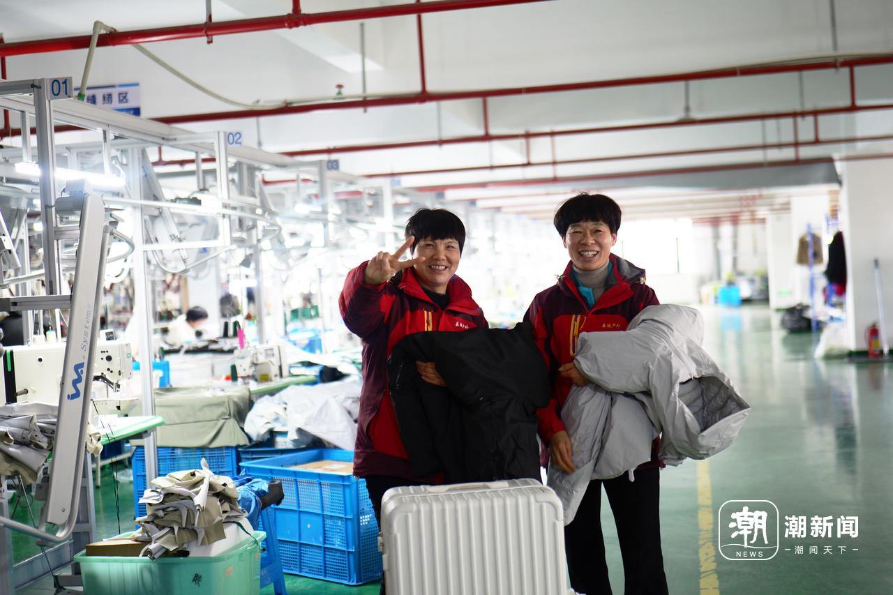 车间主任任夏仙(右)和员工叶美霞(左)带着刚从生产线上“热乎出炉”的羽绒服,即将启程前往哈尔滨过年假。记者许峰摄
