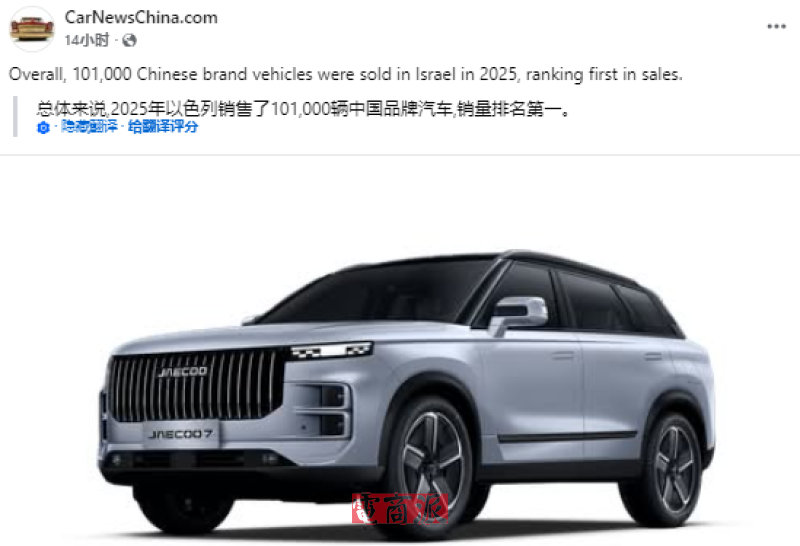 据以色列汽车进口商协会(IVIA)最新发布的数据显示,过去一年,中国品牌汽车在以色列的总销量达到10.1万辆,位居市场第一。其中纯电动汽车领域优势更为明显,中国品牌以79.2%的市场份额遥遥领先,全年销量4.6万辆,相当于当地每卖出10辆纯电动车,就有近8辆来自中国。