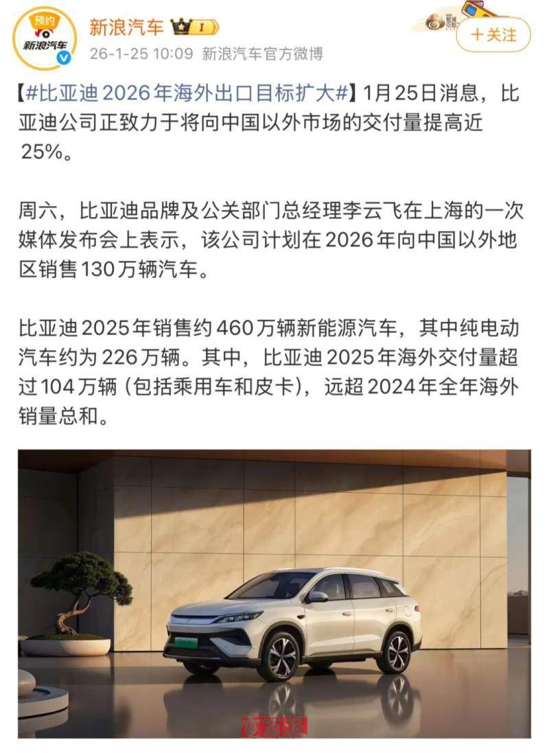 2025年,比亚迪海外汽车交付量首次突破百万大关,达到105万辆,在全年总销量中的占比提升至22.9%,较上年提高了近13个百分点。以此计算,2026年的目标较2025年增幅接近25%,清晰传递出其深耕海外市场的战略重心。