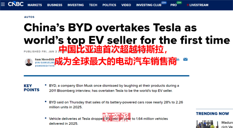比亚迪电动车销量超越特斯拉图源:CNBC
