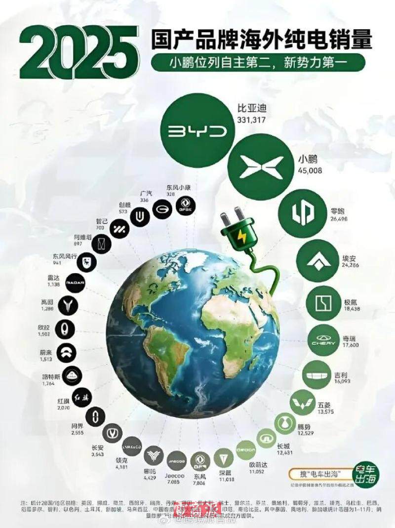 值得一提的是,小鹏汽车在2025年的海外业务取得跨越式进展,全年海外交付45008辆,在所有自主品牌里排在第二,仅次于比亚迪。
