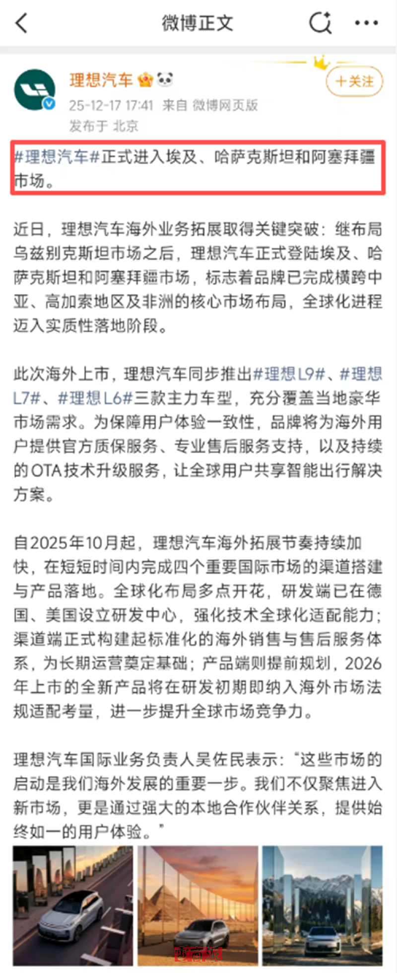 而相比他们出海更晚的理想汽车,也正在加快节奏。2025年10月,理想汽车宣布,位于乌兹别克斯坦首都塔什干的首家授权零售中心正式开业,主打理想 L9、L7、L6 三款增程电动产品;不久后,理想再度官宣拓展埃及、哈萨克斯坦和阿塞拜疆三大市场,补全全球版图。