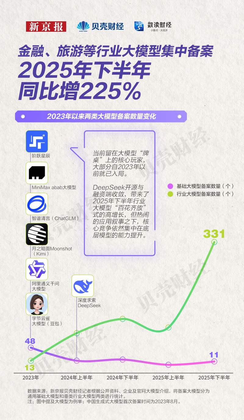 为回溯这一轮赛道分化的过程,新京报贝壳财经记者根据企业公开资料,将中国网信办备案的生成式大模型分为基础大模型和行业大模型两类。数据显示,自2023年8月生成式大模型首次备案启动,当年备案的61个模型中,基础大模型占比接近八成,行业大模型仅占两成。
