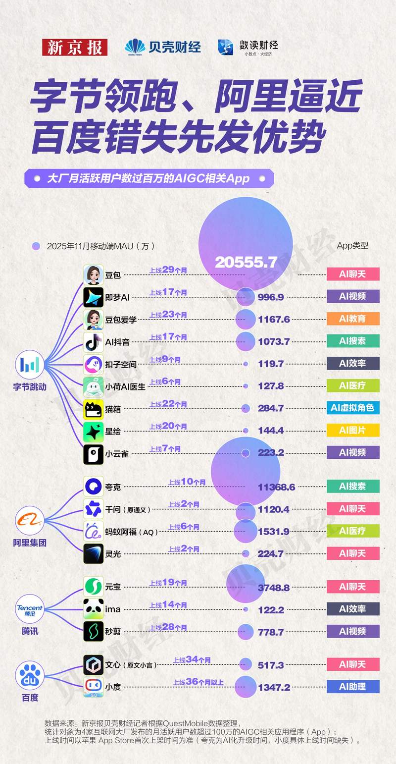 QuestMobile数据显示,截至2025年11月,蚂蚁阿福App上线6个月,MAU就已突破1500万,远超同期字节系发布的小荷AI医生(127.8万);千问App上线公测仅2个月MAU即突破1000万,几乎赶超已上线一年的豆包爱学,显示出阿里系在应用侧的推进速度之快。
