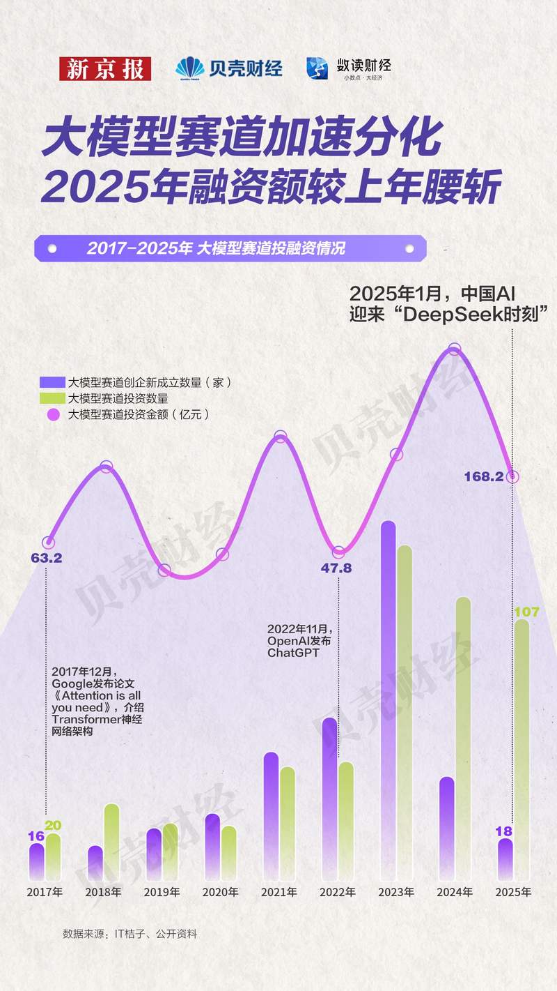 一方面,投融资端明显收敛,新进入者数量快速下降,资本开始向少数企业集中。IT桔子数据显示,近年来大模型(AIGC)赛道的新成立企业数量明显减少,2025年仅新增18家,显著低于2023年的147家;同期,行业投资金额也从2024年的372亿元腰斩,降至168.18亿元,几近腰斩。资本对大模型企业的要求,已经从早期的技术叙事转向了更清晰的商业确定性。