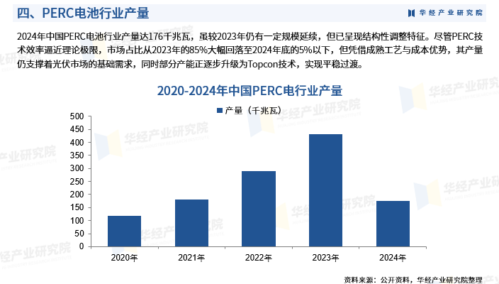 2024年中国PERC电池行业产量达176千兆瓦,虽较2023年仍有一定规模延续,但已呈现结构性调整特征。尽管PERC技术效率逼近理论极限,市场占比从2023年的85%大幅回落至2024年底的5%以下,但凭借成熟工艺与成本优势,其产量仍支撑着光伏市场的基础需求,同时部分产能正逐步升级为Topcon技术,实现平稳过渡。