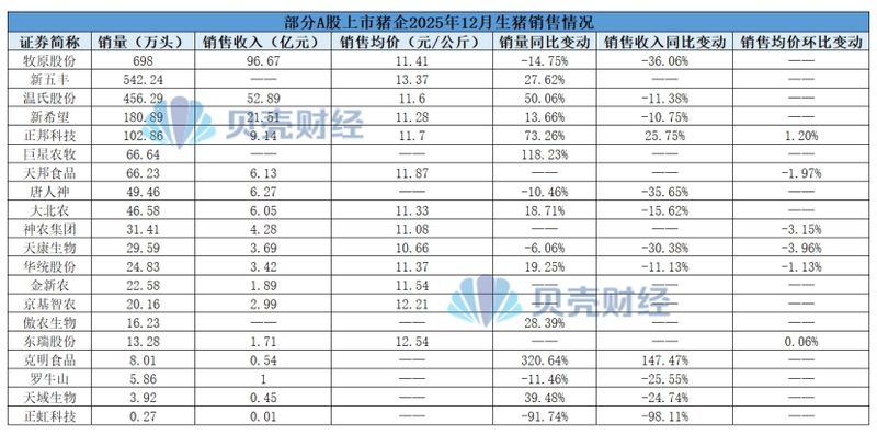 部分A股上市猪企2025年12月生猪销售情况。新京报贝壳财经记者阎侠制图