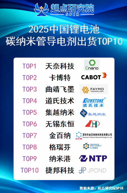 起点研究院SPIR统计2025年出货量TOP10企业分别为:天奈科技、三顺纳米、曲靖飞墨、道氏技术、集越纳米、无锡东恒、金百纳、格瑞芬、纳米港和捷邦科技。