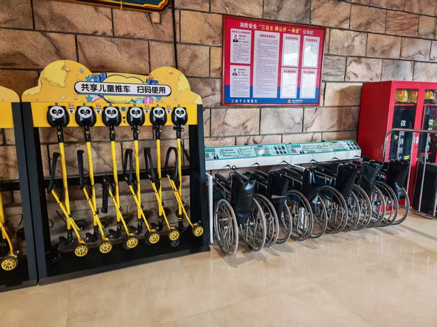 记者体验某险企最新开发的旅居康养项目,景区摆放轮椅供老年人使用(记者曹媛/摄)