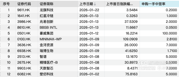 Wind数据显示,2026年开年以来,港股市场已有12家企业完成IPO,分别为壁仞科技、精锋医疗-B、天数智芯、智谱、MINIMAX-WP、金浔资源、瑞博生物、豪威集团、兆易创新、红星冷链、BBSB INTL、龙旗科技。行业高度集中于人工智能概念(7家),另有生物医疗(2家)。