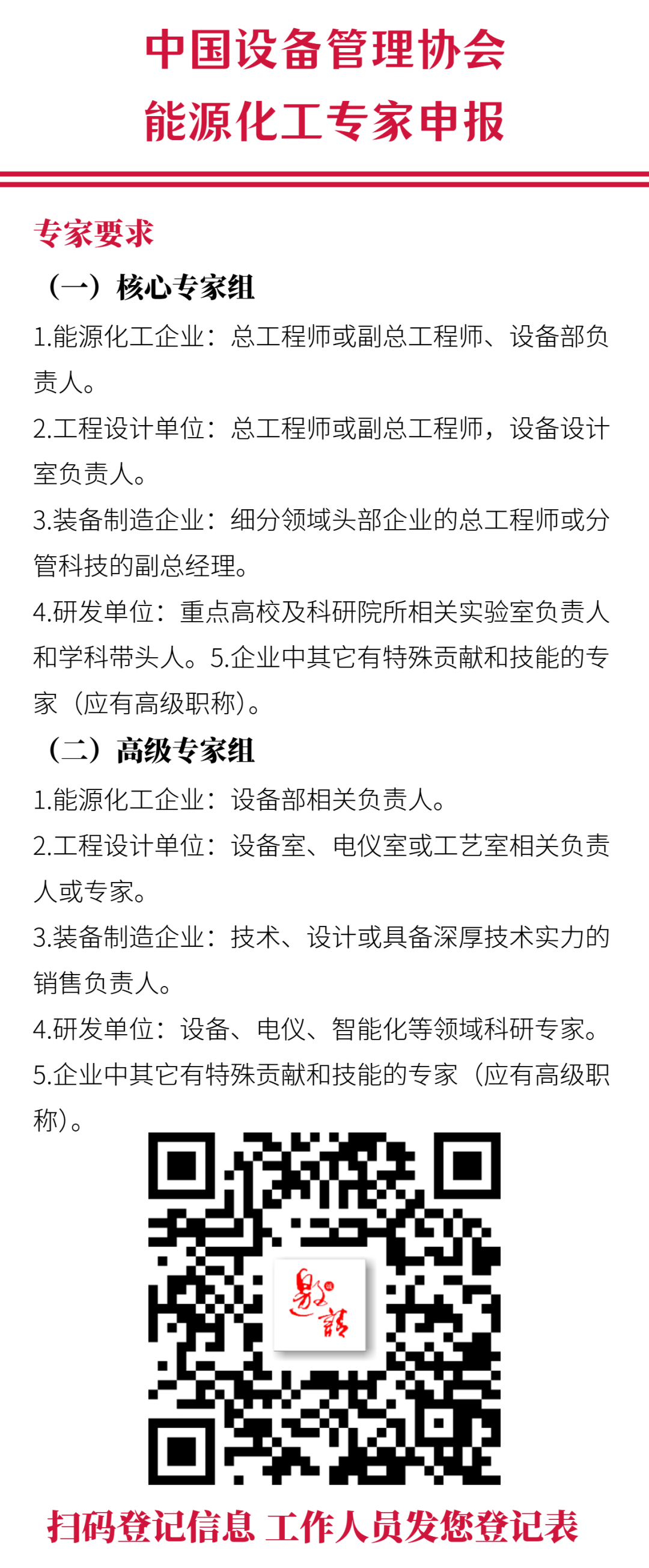 为进一步提升能源化工分会的专业引领性和行业公信力,赋能产业转型升级目标落地,分会筹备组将面向产、学、研、用全链条,严格遴选并组建“中国设备管理协会专家库能源化工行业专家组”。该专家组将汇聚一批专业造诣深厚、实践经验丰富、行业信誉卓著,兼具战略视野与务实服务精神的权威专家。以高度的责任感和使命感,深度参与分会工作,为政府决策提供智力支撑,为产业升级提供战略咨询,为企业发展提供专业解决方案,共同推动我国能源化工装备及产业向高端化、智能化、绿色化目标加速迈进。