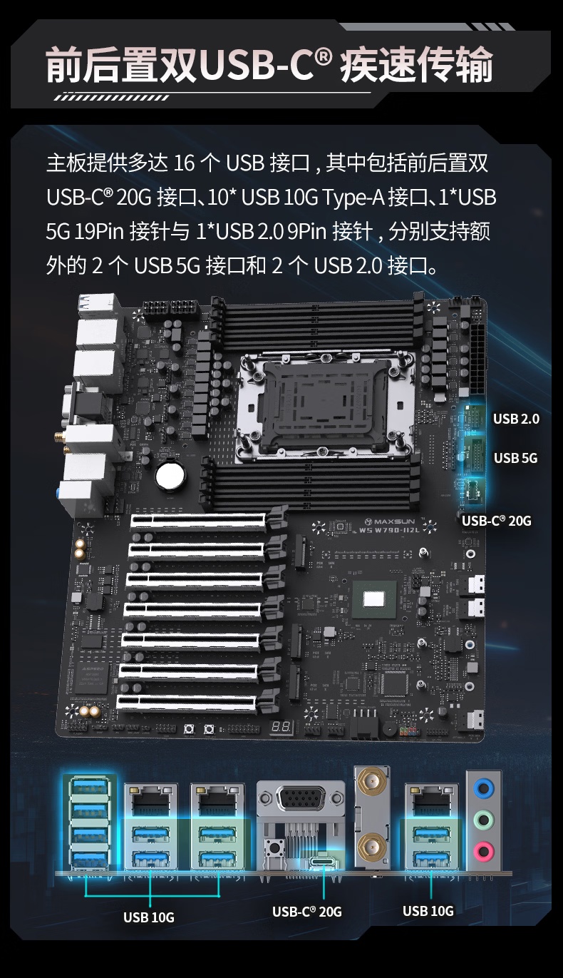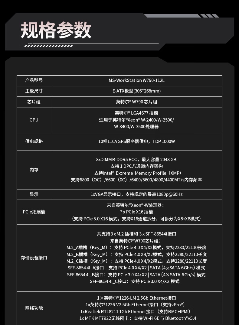 这款 E-ATX 主板采用了 Intel W790 芯片组、LGA 4677 插槽,尺寸为 305*268mm,采用 10 相 110A SPS 服务器级数字供电设计,支持至强 W-2400、W-2500、W-3400、W-3500 处理器。
