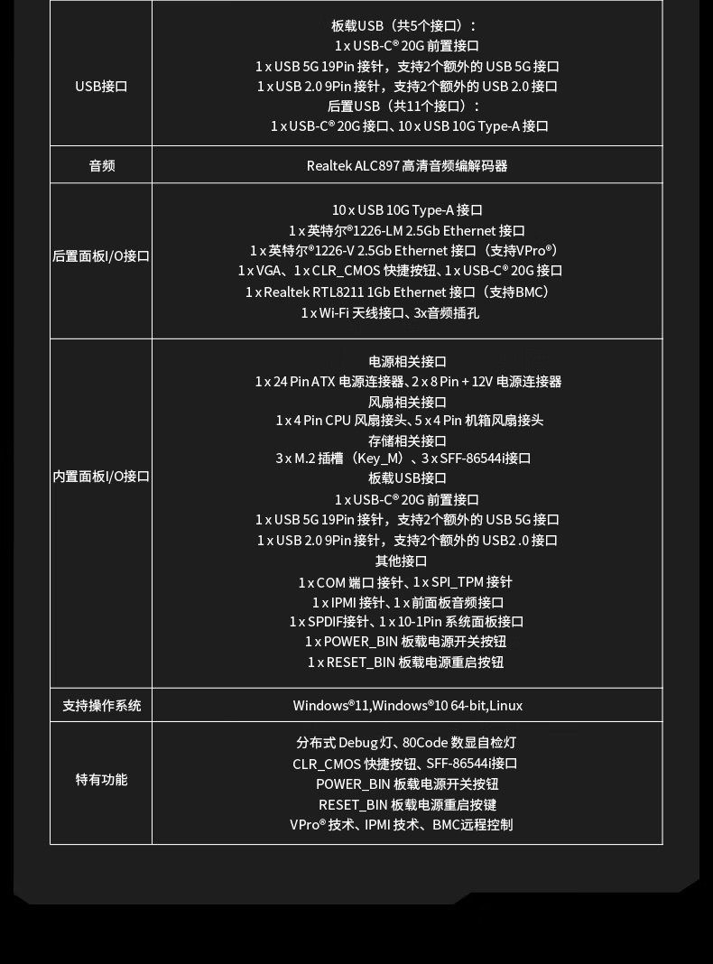其他方面,这款主板配备了双 2.5G 网卡+一个千兆网卡,提供 2*USB-C(20G)、10*USB-A(10G)、1*USB-A(5G)19Pin 接针、1*USB 2.0 的 9Pin 接针,支持 IPMI+BMC+VPRO 远程管理系统,支持 WiFi 6E 及蓝牙 5.4。IT之家附参数详情: