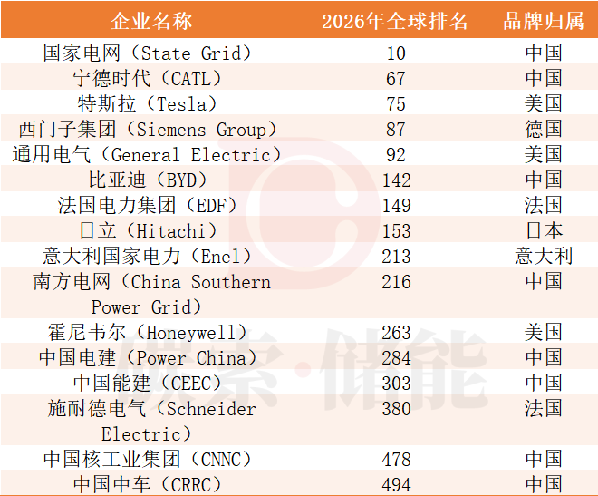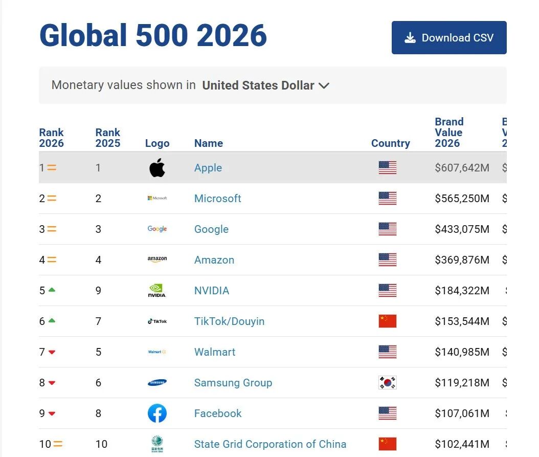 碳索储能网获悉,近日,国际权威品牌评估机构Brand Finance正式发布《2026年全球品牌价值500强榜单报告》。