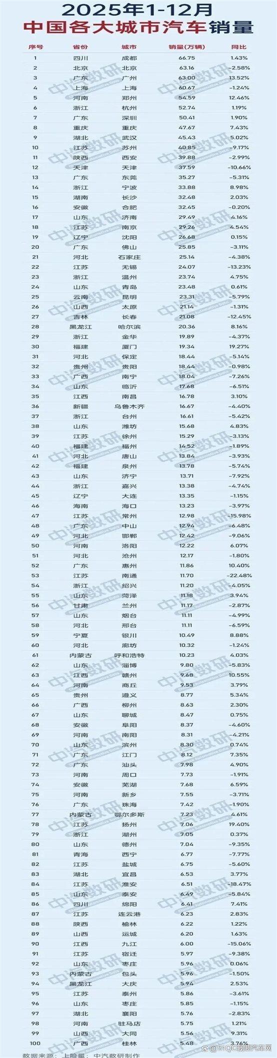 2025 年中国乘用车市场交出一份看似平淡却暗藏变局的成绩单:全年 2332.4 万辆销量微降 0.5%,但 159 城实现正增长,12 月单月环比大涨 14.1%的翘尾行情,更是让全国城市汽车销量榜完成颠覆性洗牌。成都登顶取代北上广成为“汽车消费第一城”,广州增速领跑头部,郑州等中部城市强势崛起,苏州等长三角城市遇冷,这场排名更迭的背后,是中国车市“西强中升、东部分化”的新趋势正式成型,新能源更是成为决定城市车市生死的核心胜负手。