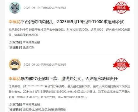 笔者发现,在黑猫投诉[下载黑猫投诉客户端]平台上,也充斥着上百条幸福花的投诉搜索词,投诉内容主要集中在胡乱扣款、借款未到账、暴力催收等。