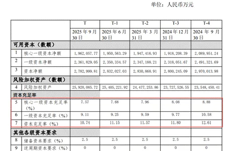 从报告中可以看到,2020年,张家口银行的核心一级资本充足率、一级资本充足率、资本充足率分别为9.09%、10.42%、12.22%。而从2024年9月开始,每季度的充足率都在下降,到2025年9月,三个充足率已经分别降至7.57%、9.11%、10.74%,已经很接近监管要求的底线水平了。