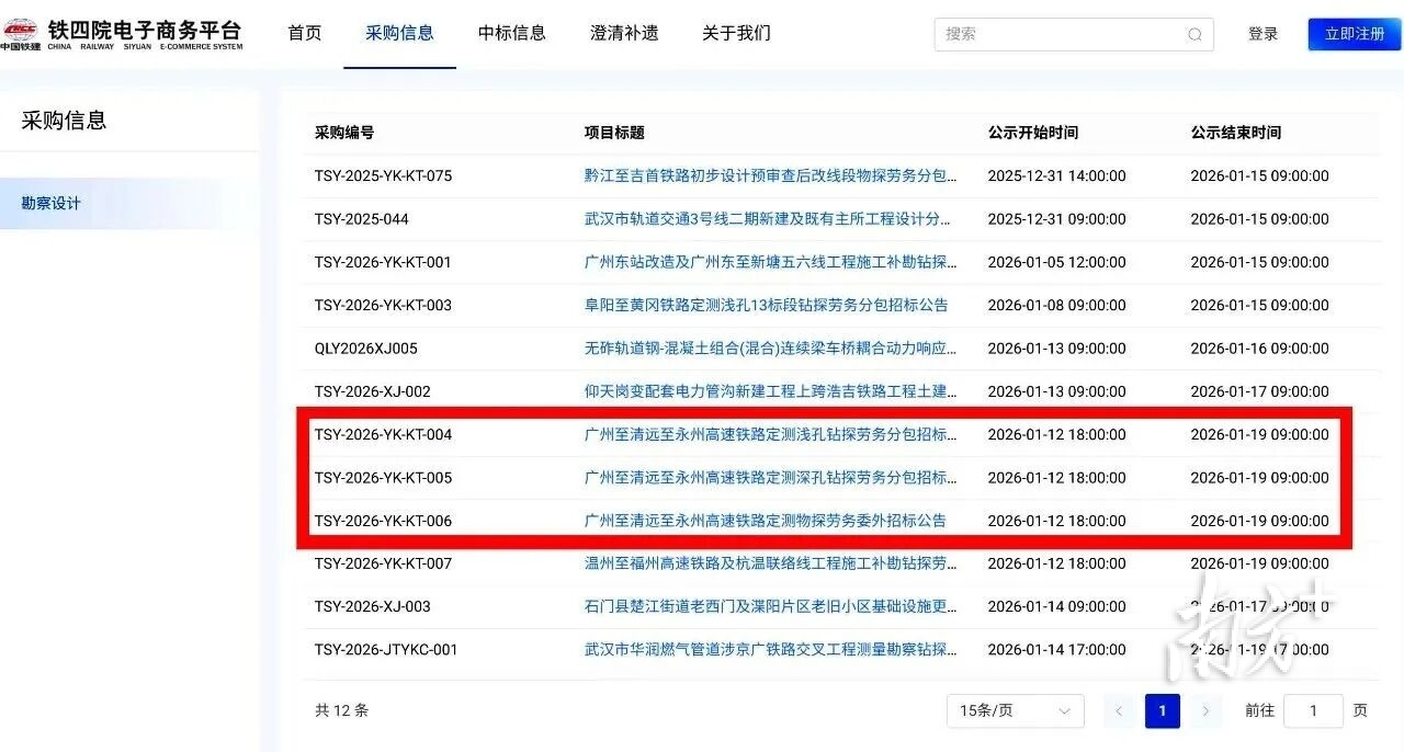 2026年1月12日,中铁第四勘察设计院发布广州至清远至永州高速铁路定测物探、深孔及浅孔钻探劳务相关招标公告,距离开工建设又近一步。