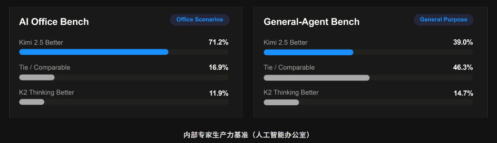 针对实际办公场景,K2.5 展示了处理高密度、大规模知识工作的能力。内部的“AI Office 基准测试”显示,相比此前的 K2 Thinking 版本,新模型在处理文档、电子表格及构建金融模型等端到端任务上的性能提升了 59.3%。