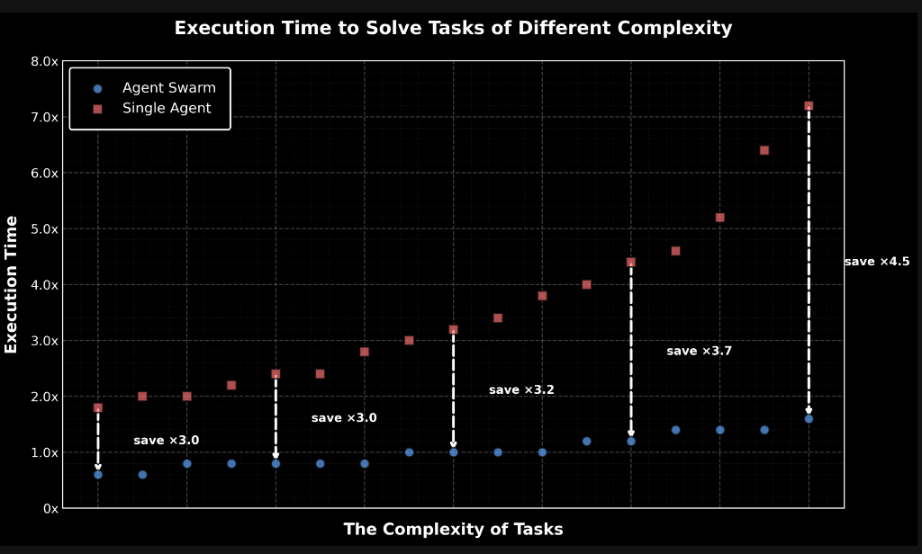 根据公司周二发布的声明,最新的 K2.5 模型采用原生多模态架构,能够通过单一提示词同时处理文本、图像和视频。该模型最显著的技术突破在于其“智能体集群”能力,能够自主调度多达 100 个子智能体并行工作。这一架构使得复杂任务的执行时间相比单智能体配置缩短了最高 4.5 倍,大幅提升了处理效率。