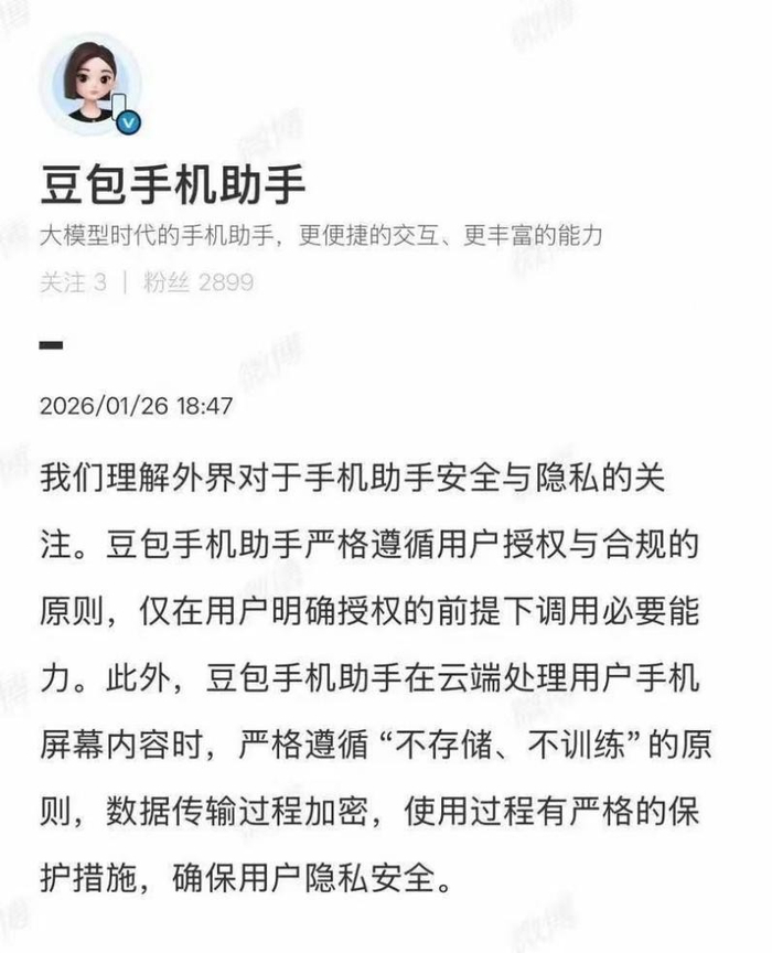 对于马化腾的评价,豆包也做出回应称:“我们理解外界对于手机助手安全与隐私的关注。豆包手机助手严格遵循用户授权与合规的原则,仅在用户明确授权的前提下调用必要能力。此外,豆包手机助手在云端处理用户手机屏幕内容时,严格遵循‘不存储、不训练’的原则,数据传输过程加密,使用过程有严格的保护措施,确保用户隐私安全。”