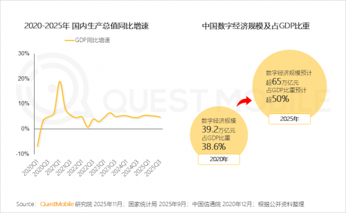 QuestMobile数据显示,2025年是中国数字经济从“量变”转向“质变”的关键分水岭,预计全年数字经济规模将超65万亿元,占GDP比重突破50%,正式成为国民经济的核心引擎。