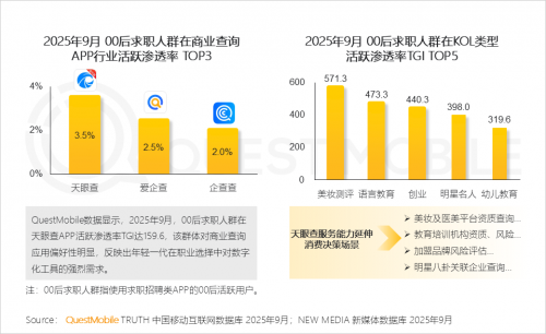 QuestMobile数据显示,截止2025年9月,天眼查APP月活跃用户规模达2802万,同比增长6.9%,核心用户群体高度聚焦于90后,其活跃占比达32.7%,同比提升5.7%。