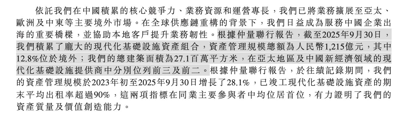 根据仲量联行报告,截至2025年9月30日,京东产发积累了庞大的现代化基础设施资产组合,资产管理规模总额为1,215亿元,其中12.8%位于境外;公司的总建筑面积为2710万平方米,在亚太地区及中国新经济领域的现代化基础设施提供商中分别位列前三及前二。