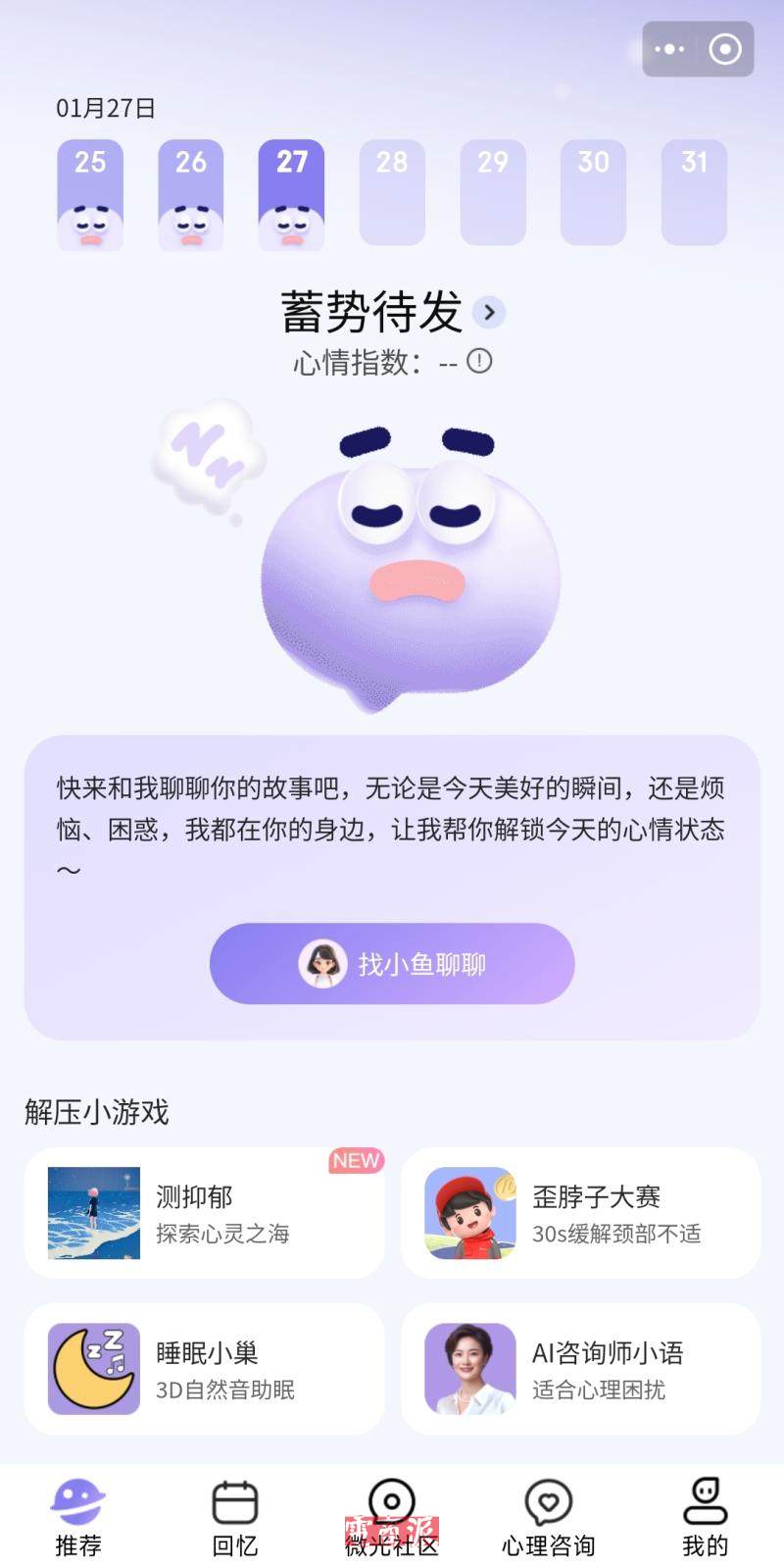 “聊愈小宇宙”,可以看做是一个主要以AI心理咨询和社区为一体的产品。用户可以和AI心理咨询师小鱼进行情绪化聊天,话题包括但不限于烦心事、困惑、矛盾等事件。每天的聊天对话会按照恐慌、期盼、沮丧、怨愤、喜悦和感恩进行记录,并形成回忆日历。用户之间也可以在“微光社区”中进行讨论交流,在分享释放情绪的同时,引起与他人的情感共鸣。由于“聊愈小宇宙”还自带有心理健康类的产品属性,所以产品中还安排有专业的心理咨询师付费服务。