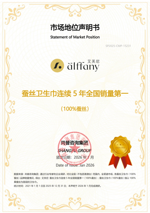 2026年1月,尚普咨询集团向艾芙尼颁发市场地位声明书。艾芙尼荣获【蚕丝卫生巾连续5年全国销量第一(100%蚕丝)】市场地位声明,标志着其在女性护理行业的卓越地位及消费者的高度认可与信赖。