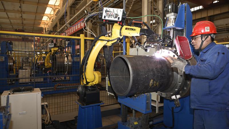 2025年12月底,在兰石装备公司金结车间,新引进的自行走全场景大件焊接机器人投入使用——只见机械臂灵活转向焊接点位,飞溅的焊花中,一道均匀的焊缝逐渐成形。整个智能化焊接过程中,工人只需要在另一旁的屏幕前观察实时焊接画面,监测数据即可。