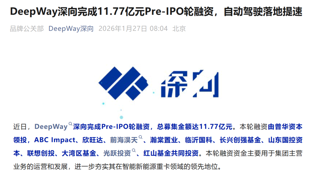 超11亿PreIPO融资,DeepWay深向领跑智能重卡赛道