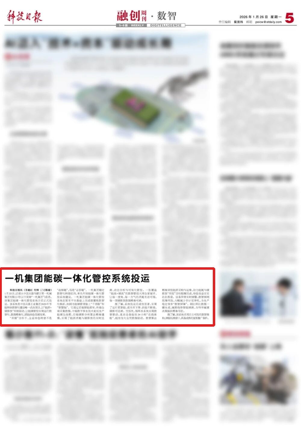 1月26日,《科技日报》第五版刊发了《一机集团能碳一体化管控系统投运》的文章,报道了一机集团上线能碳一体化管控系统,实现能源与碳排放数智化监测和精准管控,助力绿色低碳发展。现将文章全文予以转发。