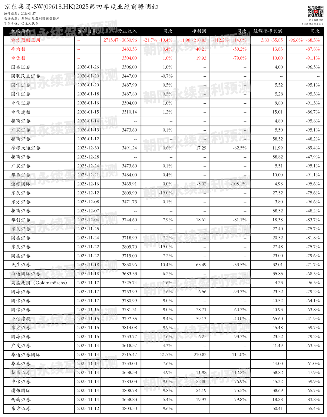 截至2026年01月27日,根据朝阳永续季度业绩前瞻数据: