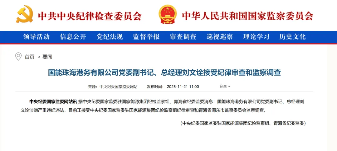 11月21日,据中央纪委国家监委驻国家能源集团纪检监察组、青海省纪委监委消息:国能珠海港务有限公司党委副书记、总经理刘文诠涉嫌严重违纪违法,目前正接受中央纪委国家监委驻国家能源集团纪检监察组纪律审查和青海省海东市监察委员会监察调查。