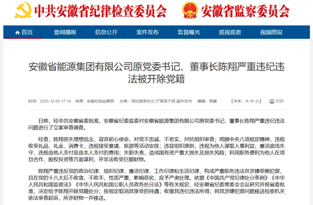 12月5日,安徽纪检监察网发布信息显示,安徽省能源集团有限公司原党委书记,董事长陈翔严重违纪违法被开除党籍。