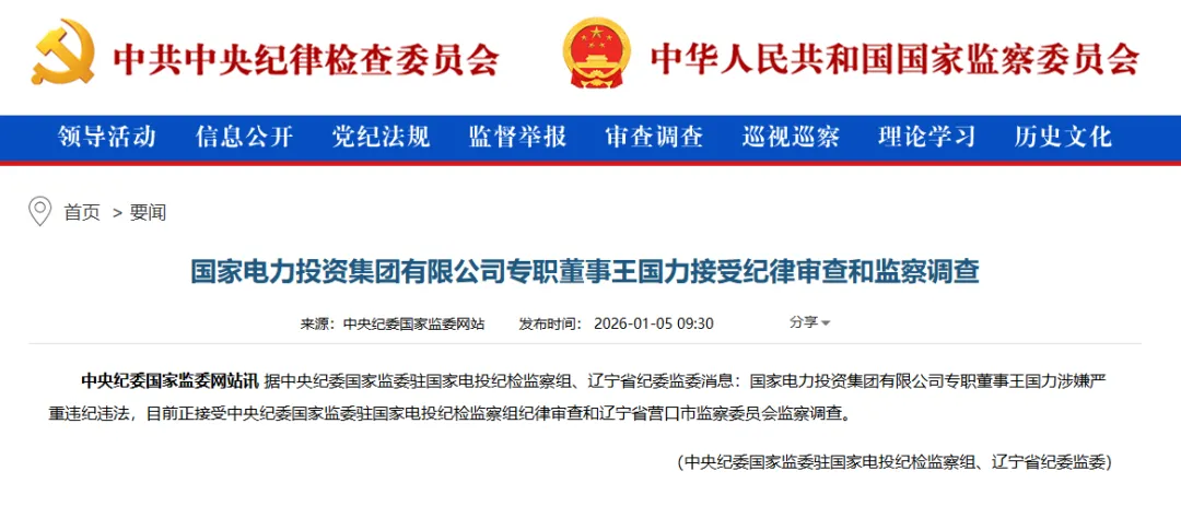 1月5日消息,据中央纪委国家监委驻国家电投纪检监察组、辽宁省纪委监委消息:国家电力投资集团有限公司专职董事王国力涉嫌严重违纪违法,目前正接受中央纪委国家监委驻国家电投纪检监察组纪律审查和辽宁省营口市监察委员会监察调查。