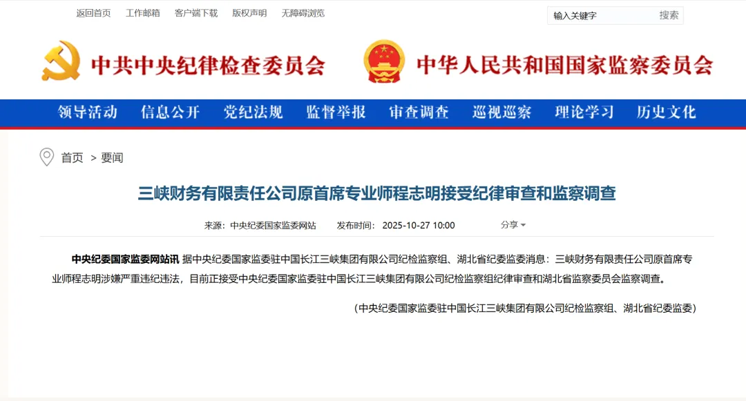 10月27日,根据中央纪委国家监委网站信息显示,据中央纪委国家监委驻中国长江三峡集团有限公司纪检监察组、湖北省纪委监委消息:三峡财务有限责任公司原首席专业师程志明涉嫌严重违纪违法,目前正接受中央纪委国家监委驻中国长江三峡集团有限公司纪检监察组纪律审查和湖北省监察委员会监察调查。