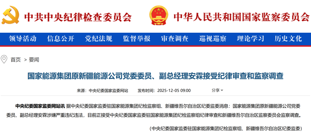 12月5日,国家能源集团原新疆能源公司党委委员、副总经理安霖接受纪律审查和监察调查。