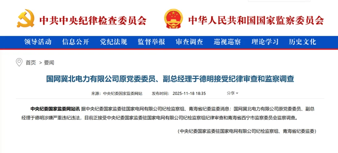 11月18日,据中央纪委国家监委驻国家电网有限公司纪检监察组、青海省纪委监委消息:国网冀北电力有限公司原党委委员、副总经理于德明涉嫌严重违纪违法,目前正接受中央纪委国家监委驻国家电网有限公司纪检监察组纪律审查和青海省西宁市监察委员会监察调查。