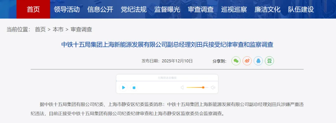 12月10日,据中铁十五局集团有限公司纪委、上海市静安区纪委监委发布信息显示,中铁十五局集团上海新能源发展有限公司副总经理刘田兵涉嫌严重违纪违法,目前正接受中铁十五局集团有限公司纪委纪律审查和上海市静安区监察委员会监察调查。