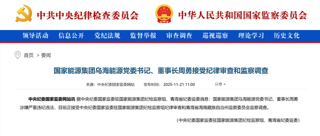 11月21日,据中央纪委国家监委驻国家能源集团纪检监察组、青海省纪委监委消息:国家能源集团乌海能源党委书记、董事长周勇涉嫌严重违纪违法,目前正接受中央纪委国家监委驻国家能源集团纪检监察组纪律审查和青海省海南藏族自治州监察委员会监察调查。
