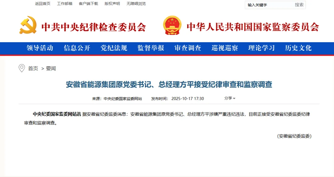 10月17日,中央纪委国家监委网站讯,据安徽省纪委监委消息:安徽省能源集团原党委书记、总经理方平涉嫌严重违纪违法,目前正接受安徽省纪委监委纪律审查和监察调查。